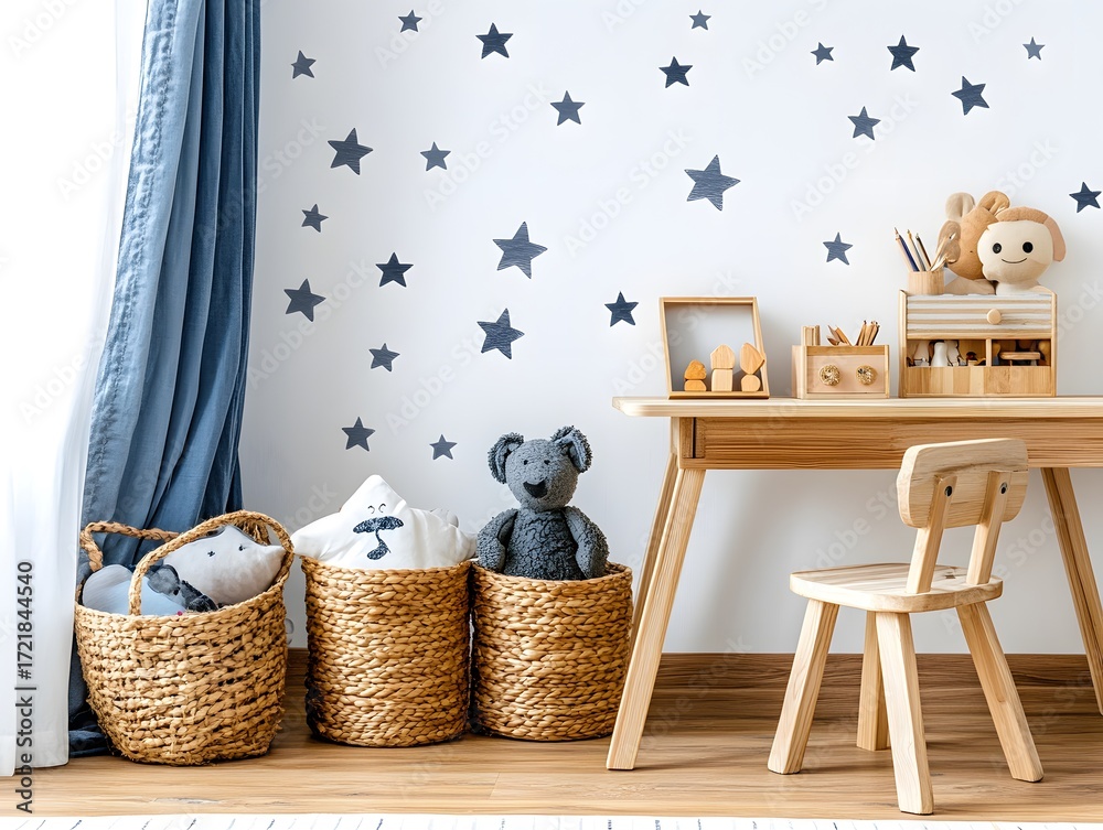Modern Scandinavian children’s bedroom interior featuring wooden frame mock-up, playful décor, and natural tones #1721844540