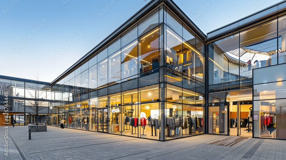 Modern shopping mall with transparent glass facade and trendy clothes store #825764440