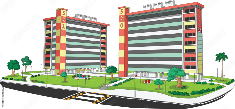 Modern Singapore public housing, in red, yellow, and green, is set amidst lush greenery, reflecting the city’s focus on urban nature and blending functionality with aesthetics for livability. #1910095924