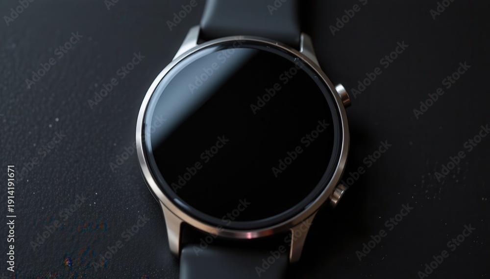 Modern smartwatch on a dark surface with a glossy screen and sleek design, showing technology and style #1914191671