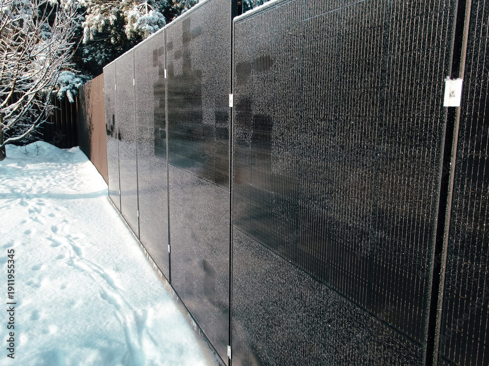 Modern solar panel array installed as a fence in a snowy backyard during winter. #1911955345