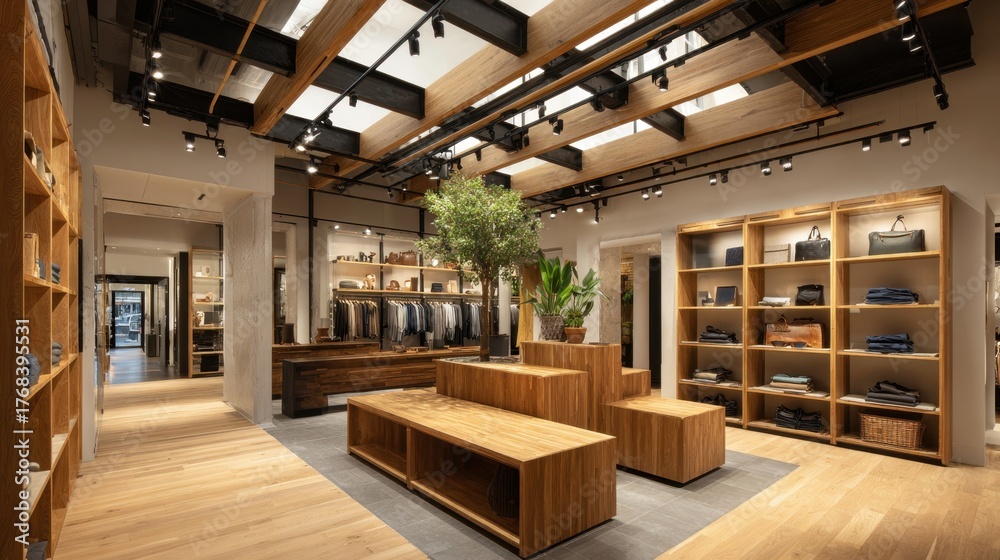 Modern store interior featuring wooden furniture plants and organized display areas for clothing. #1768395531