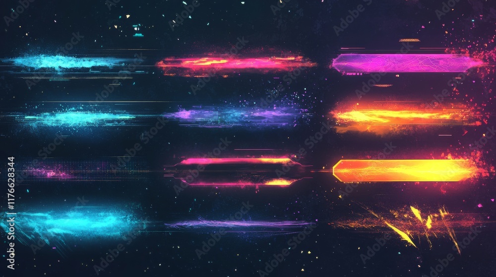 Modern technology banners collection in cyberpunk style. Abstract sci-fi text boxes with glitch effect. Futuristic hi-tech badges. Colorful glitchy background set. Vector illustration. #1176628344