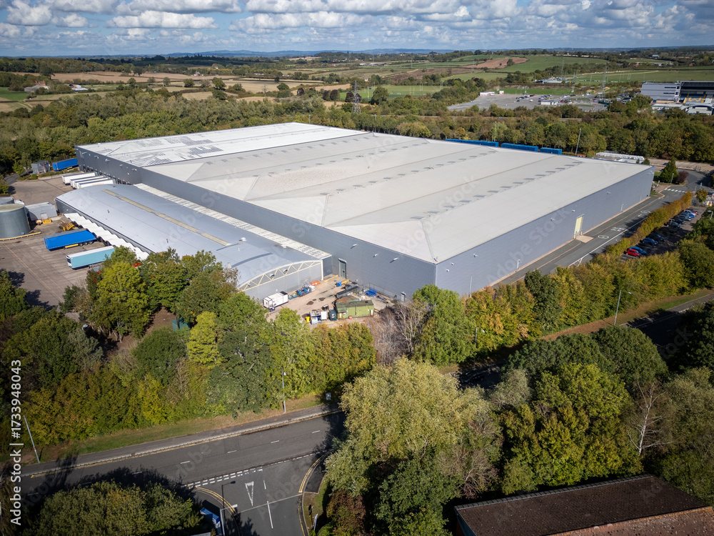 Modern warehouse and distribution depot seen from above with metal cladding, parking bays and surrounding trees in industrial estate on bright sunny day #1733948043