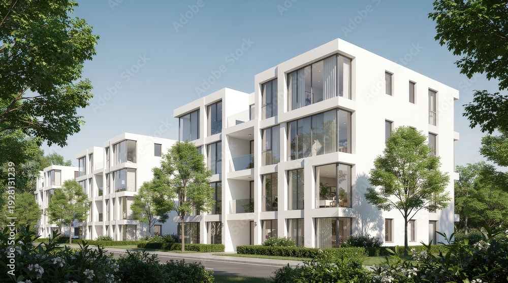 Modern white apartment buildings with large windows surrounded by greenery under a clear blue sky. #1928131239