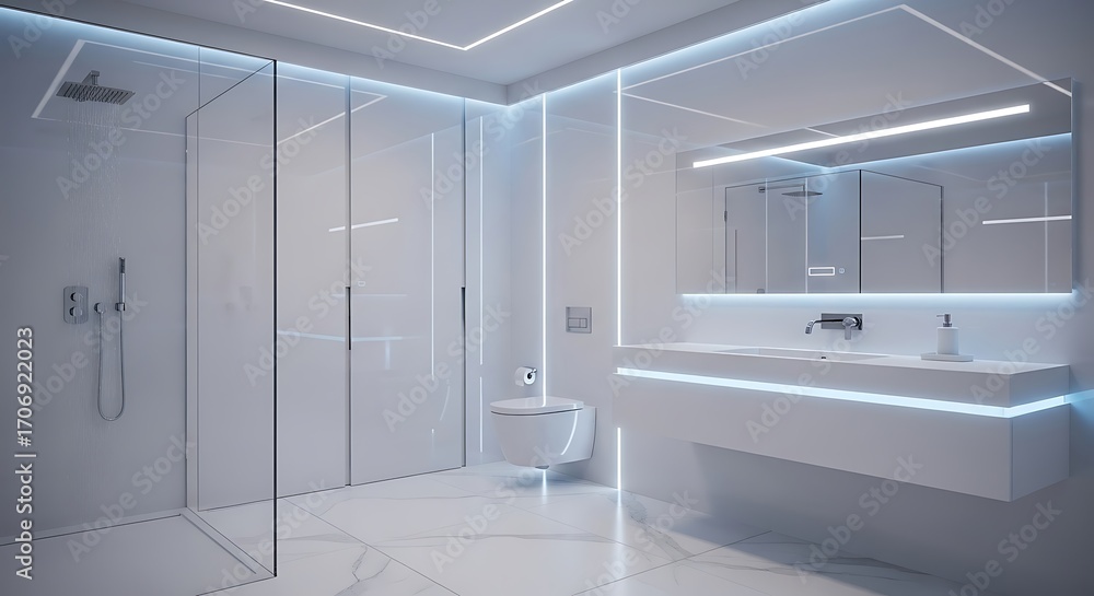 Modern White Bathroom with Neon Lighting and Minimalist Design, Featuring Shower and Toilet #1706922023