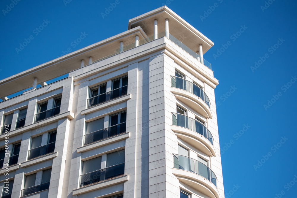 Modern White Building with Balconies Against a Blue Sky #1609865972
