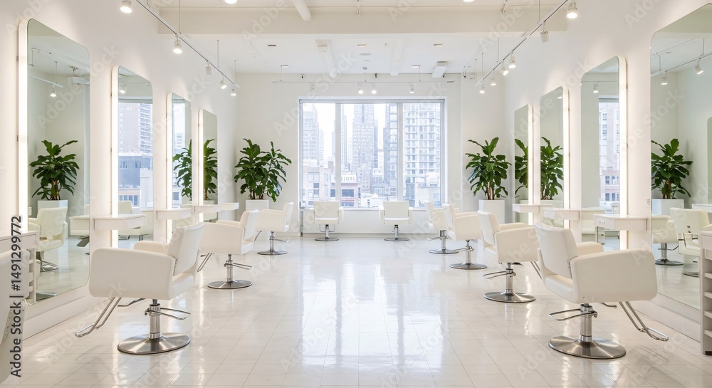 Modern white hair salon interior with styling chairs, mirrors, and city view #1491299772