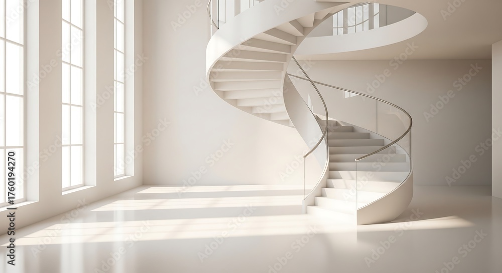Modern white spiral staircase with glass railing bathed in bright #1760194270