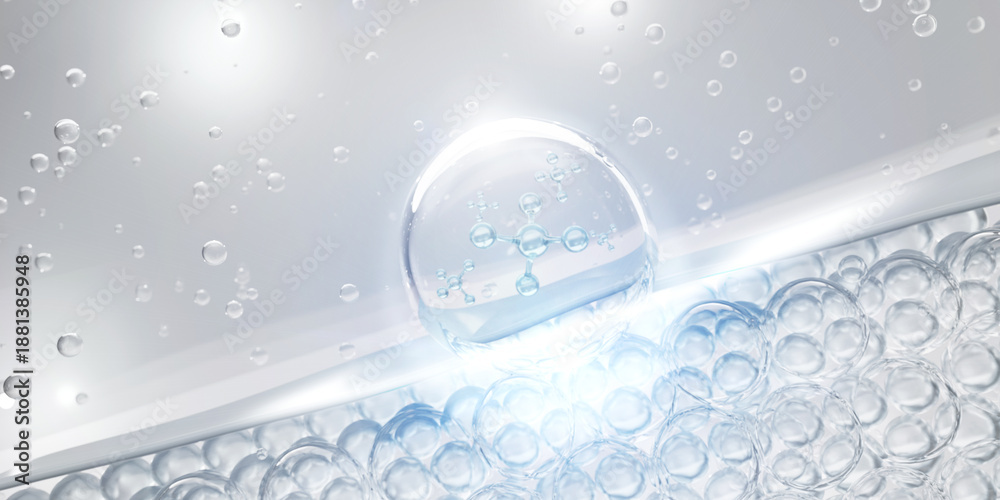 Molecule in side collagen bubble and Vitamin illustration isolated on soft color background. concept skin care cosmetics solution. 3d rendering. #1881385948