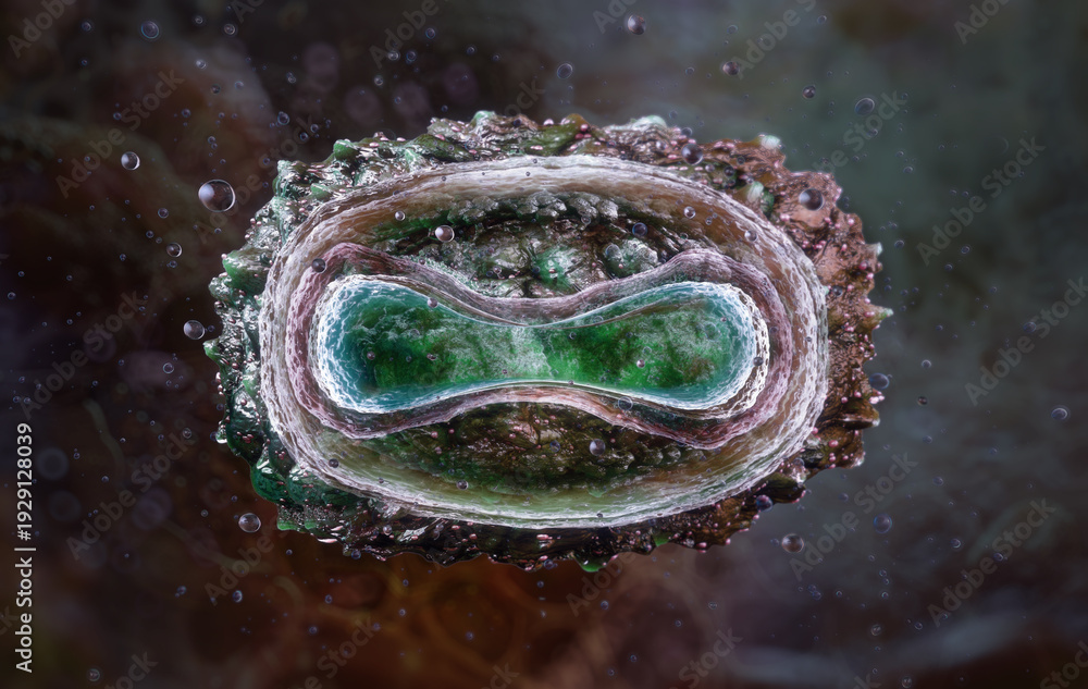 Molluscum contagiosum virion cross-section revealing internal poxvirus architecture, DNA core, protein envelope. 3D for virology education, dermatological research, and infectious disease study #1929128039
