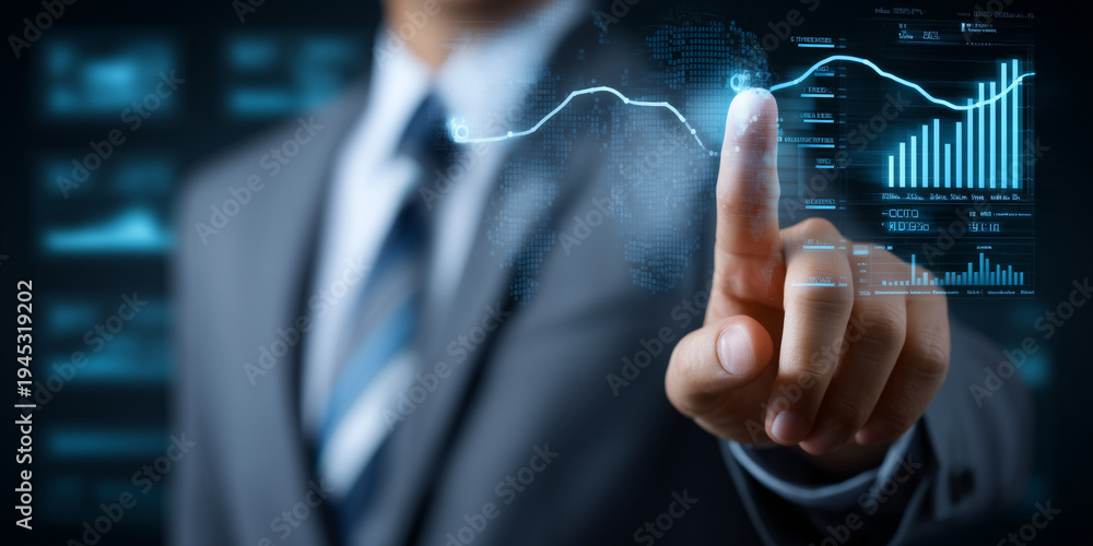 Monetary policy impact analysis financial district digital graphs corporate environment close-up view interest rate hikes trends #1945319202