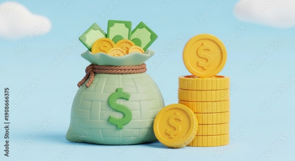 Money bag and stack of coins are placed on blue background with clouds in the sky #1908666375