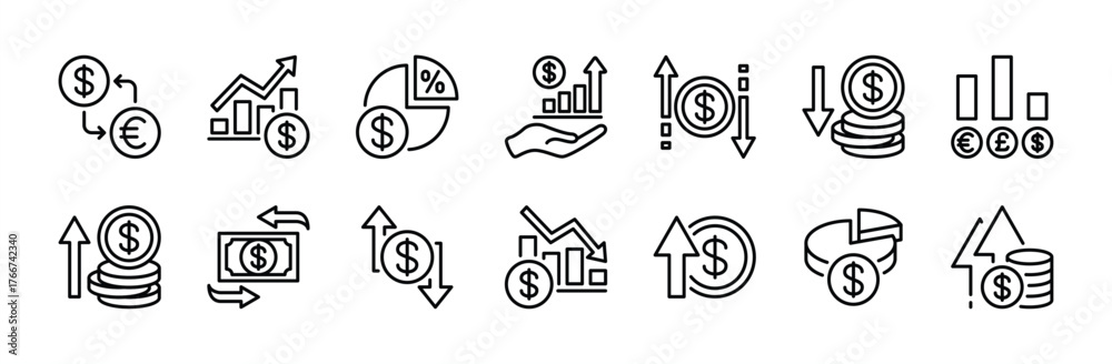 Money exchange rate icon set. Contains dollar growth chart, currency circular arrow flow, financial change, conversion, transaction, transfer, graph, diagram, income and outcome. Vector illustration #1766742340