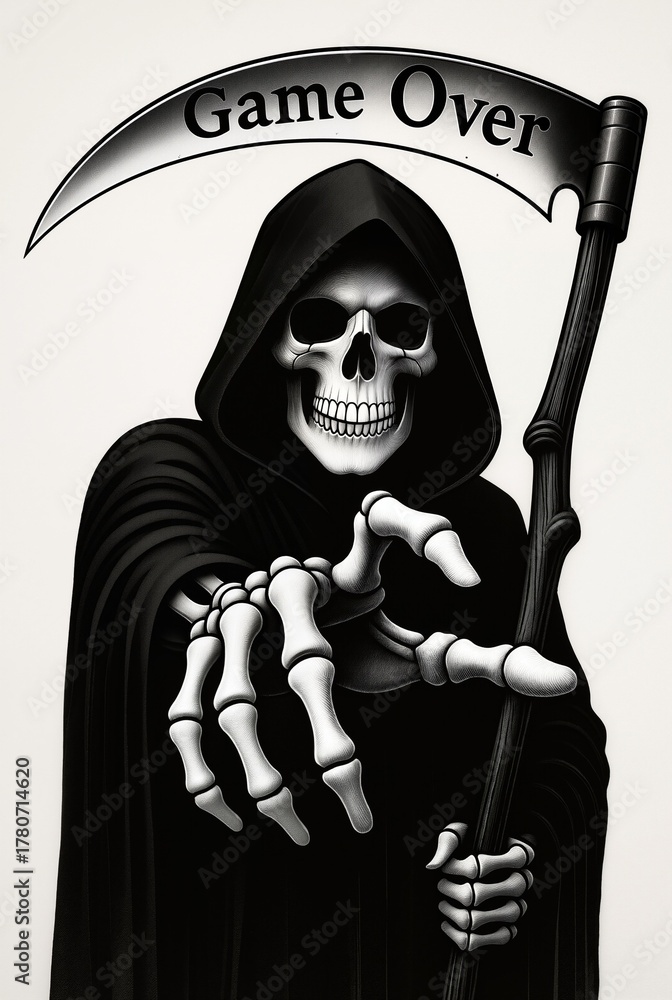 Monochrome gothic illustration of Death, Grim Reaper with the words Game Over written on the blade of his scythe. #1780714620