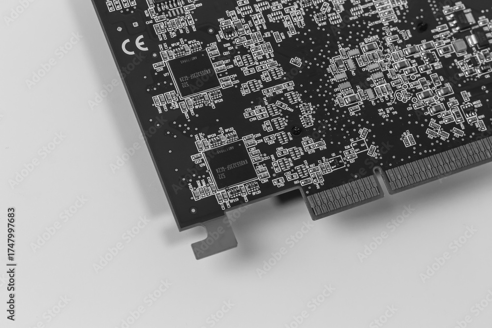 Monochrome macro photo of a black printed circuit board. The image highlights the complexity of microelectronics, showing chips, traces, and surface-mount components.#1747997683