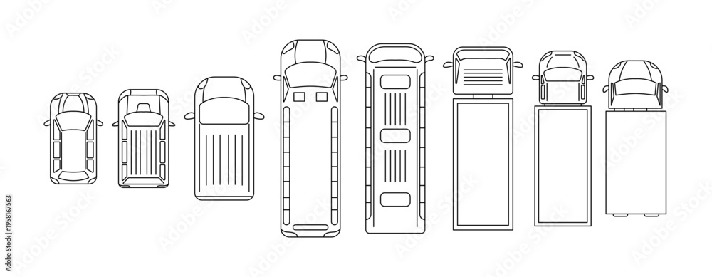 Monochrome top view illustration of various vehicles. Includes cars, buses, and trucks outlined with precision. Ideal for transport designs or educational purposes. #1958167563