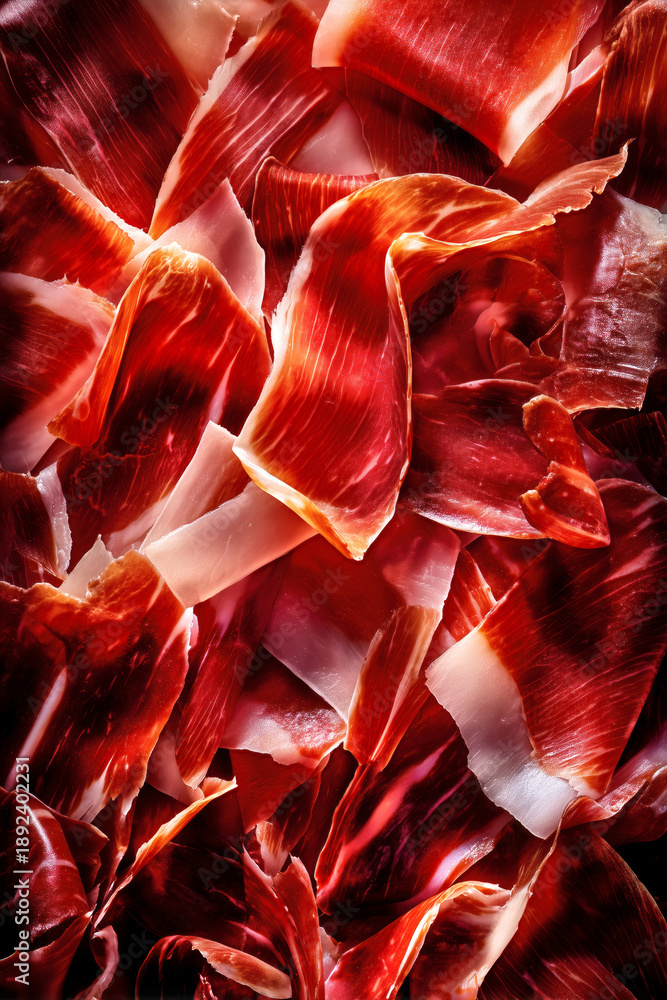 Montón de jamón ibérico pata negra en primer plano, Jamón serrano de alta calidad producto gourmet español, Fondo de jamón curado para banner de tienda de delicatessen #1892402231