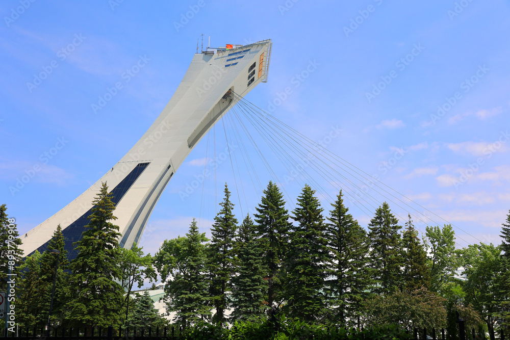 Montreal Olympic Stadium and tower, It's the tallest inclined tower in the world.Tour OlympiC stands 175 meters tall and at a 45-degree angle #893779908