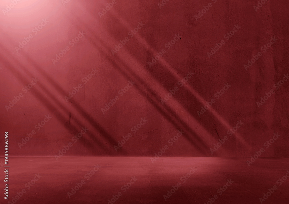 Moody Deep Red Empty Room Studio Backdrop with Dramatic Diagonal Light Streaks and Shadows on Concrete Wall and Floor for Cinematic Product Placement Showcase and Professional Photography Space. #1945886298