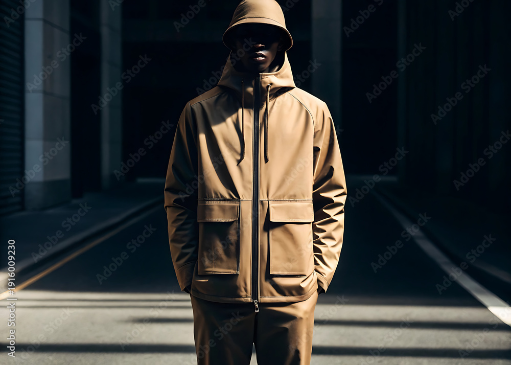 Moody hooded man in rain at night, cinematic urban street portrait #1916009230