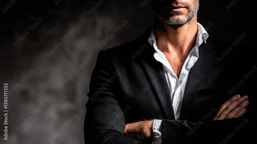 Moody portrait of confident man in black suit with open-collar white shirt and crossed arms against dark textured background #1585711352