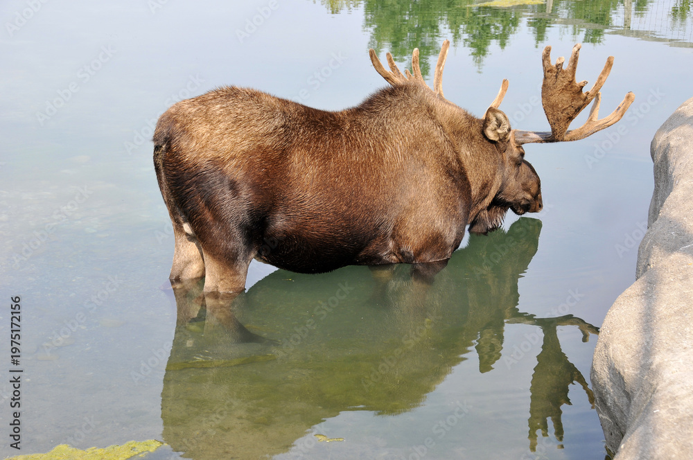 Moose (North America) or elk (Eurasia) is the largest extant species in the deer family. Moose are distinguished by the broad, flat (or palmate) antlers of the males #1975172156