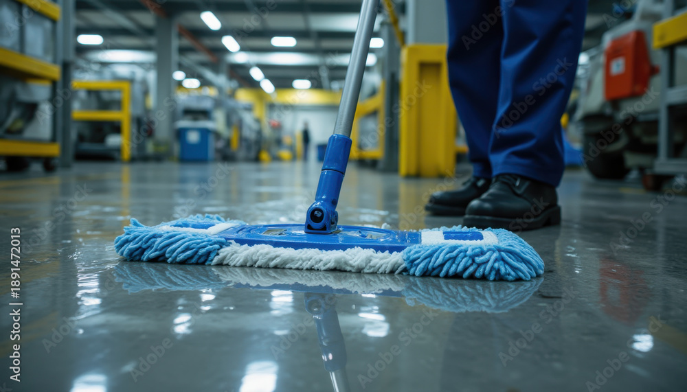 Mop cleaning warehouse floor industrial hygiene janitor water wet maintenance in factory aisle, polished concrete reflection after sanitation routine, workplace safety focus #1891472013