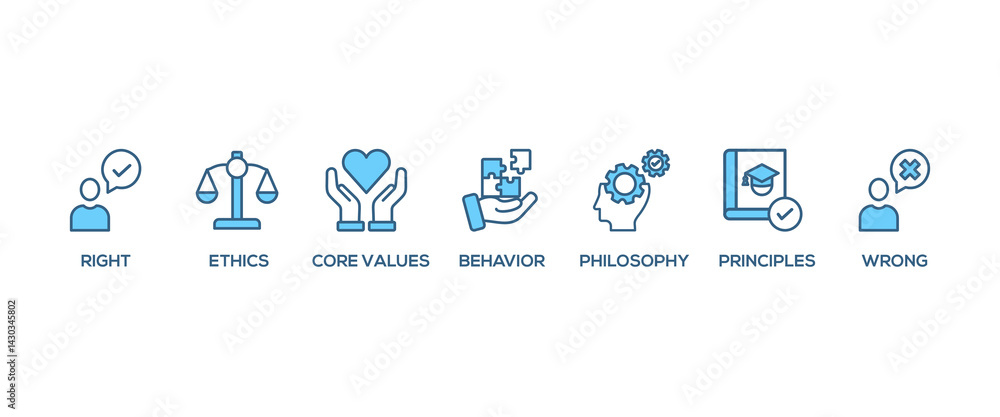 Morality banner web icon set vector symbol illustration concept with icon of Right, ethics, wrong, behavior, philosophy, society, principles, core values. Business banner web vector infographic #1430345802