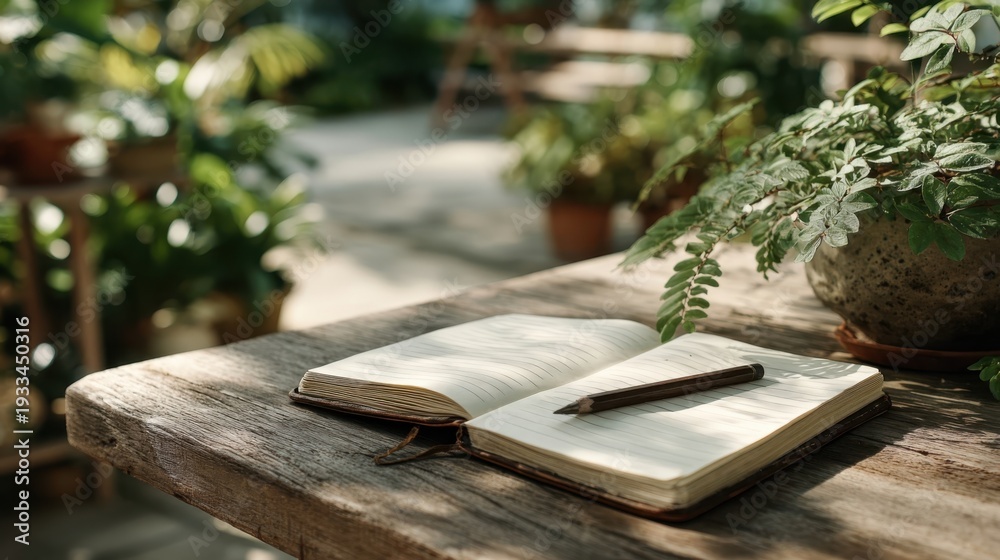 Morning outdoor relaxation with open journal and pencil on wooden garden table in lush greenery #1933450316