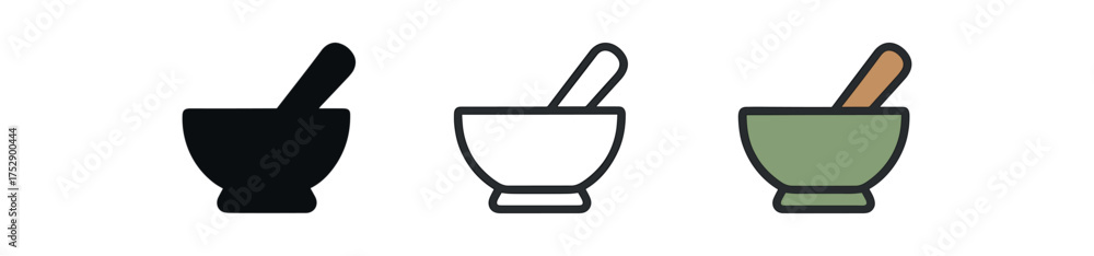 mortar and pestle icon on white background Black silhouette flat icon outline icon and colored icon style. 1x3 grid. three minimal vector icon style.centered composition clear white space #1752900444