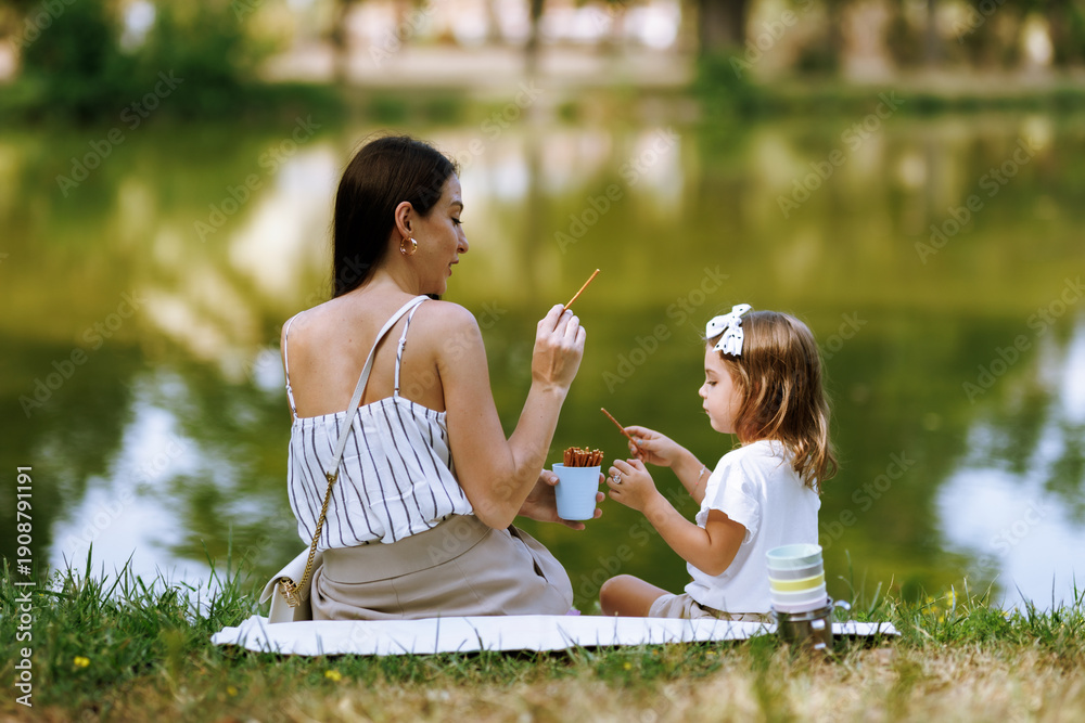 Mother and daughter enjoying a picnic by a scenic pond on a sunny day #1908791191