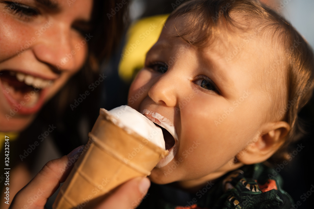 Mother feeding baby child boy ice-cream - Young mom and her baby eat white vanilla creamy dessert - Sits in a baby carriage pram - Caucasian family 1 year old #324232147