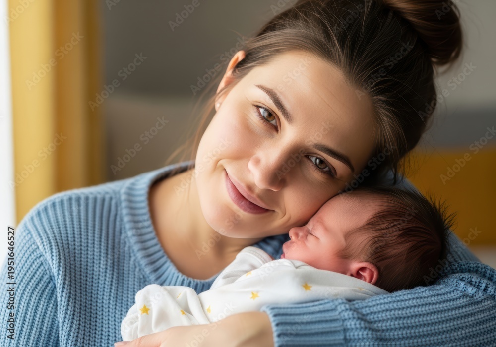 Mother holding sleeping newborn baby close with a gentle smile, wearing a blue sweater #1951646527