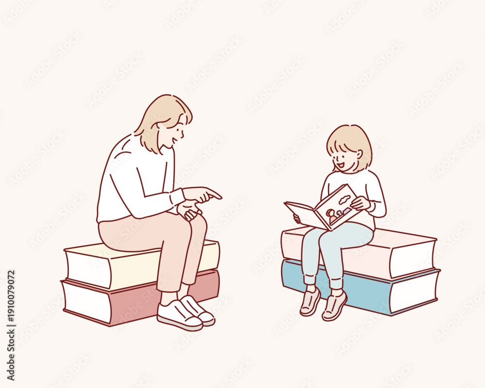 Mother teaches his kid reading books. Student studies, learning textbook with teacher. Happy girl and mom discuss novels, communicate together. Original vector illustration drawn by hand. #1910079072