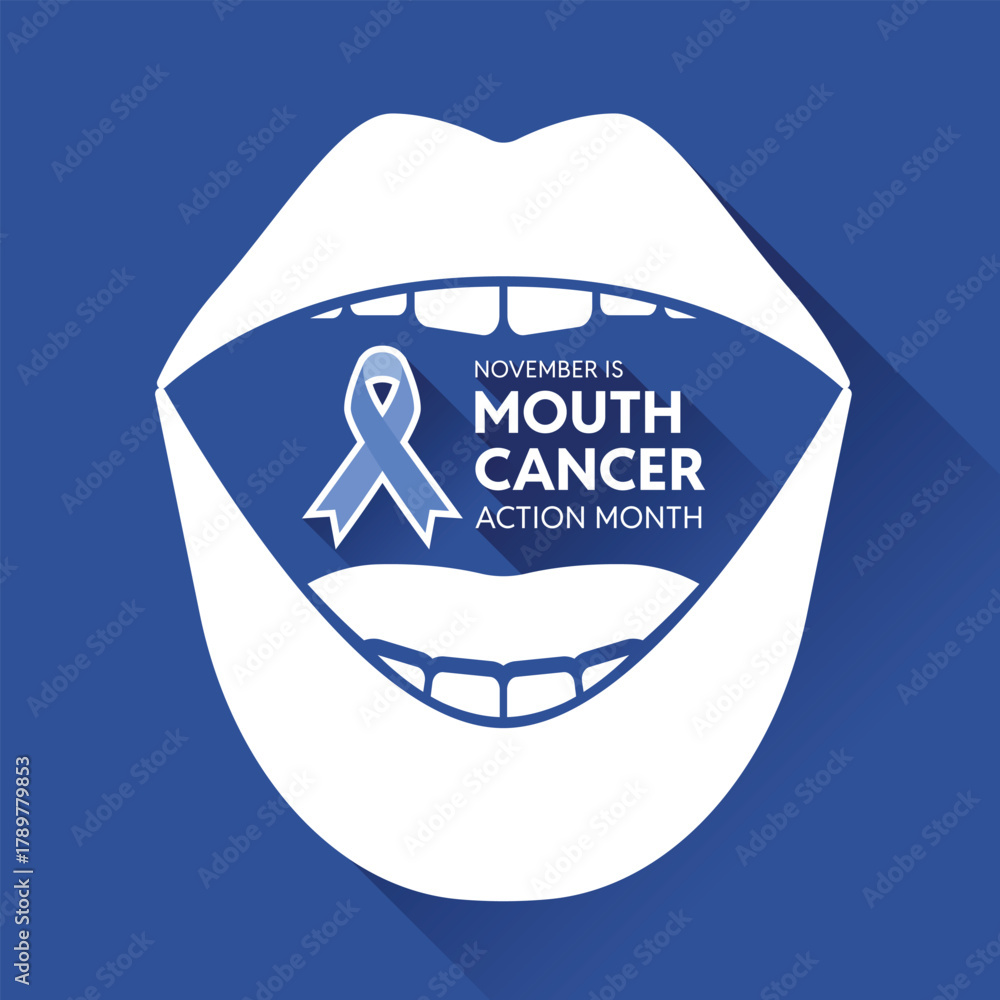 Mouth cancer action awareness - Blue ribbon and text in white open mouth on blue background vector design #1789779853