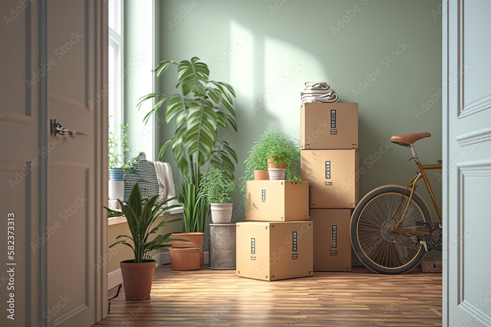 Moving: Boxes, Plants, Bike in Empty Room. Photo generative AI #582373313