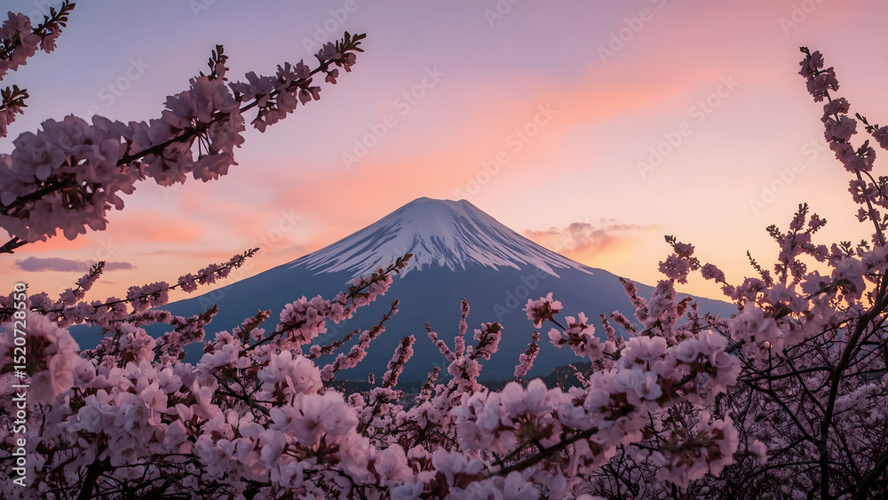 Mt. Fuji at sunset during cherry blossom season, with soft pink and white blossoms framing the snow-capped volcanic peak, #1520728550