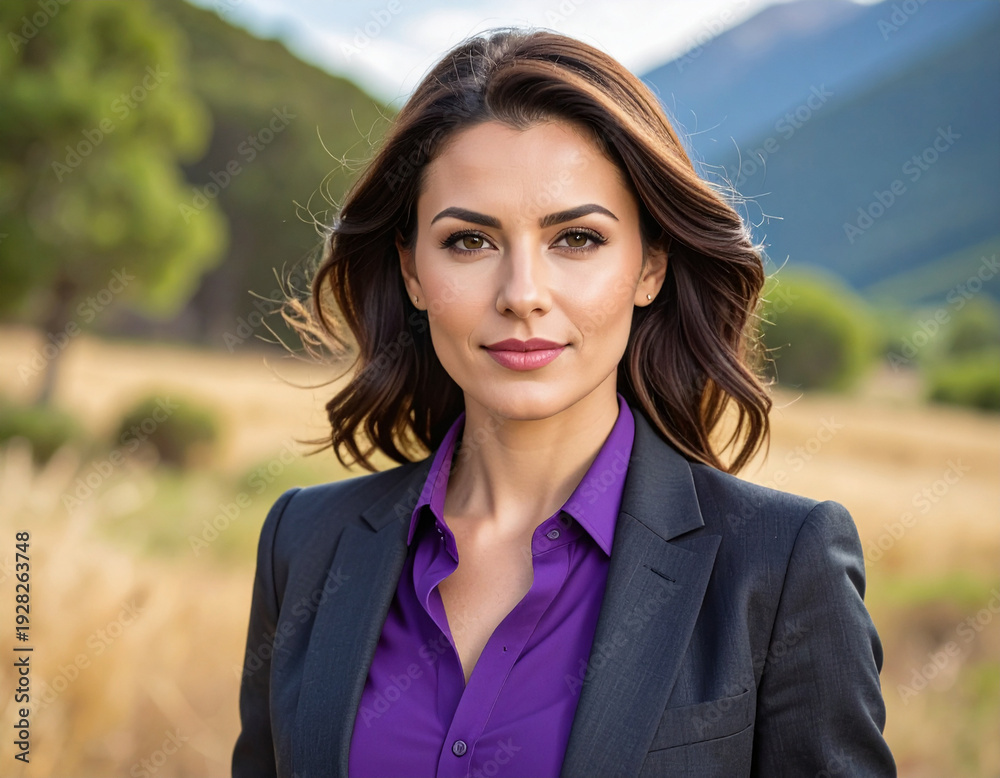 mujer agricultora con camisa morada mirando en campo de cultivo, concepto de liderazgo femenino mujer trabajadora, trabajo rural independencia y éxito en el dia internacional de la mujer #1928263748