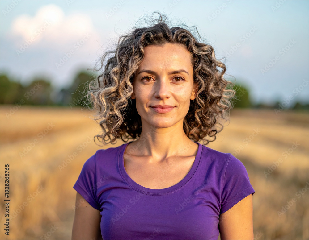 mujer agricultora con camisa morada mirando en campo de cultivo, concepto de liderazgo femenino mujer trabajadora, trabajo rural independencia y éxito en el dia internacional de la mujer #1928263765