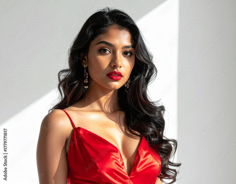 Mujer de frente, cabello suelto ondulado, vestido satinado color rojo #1779771817