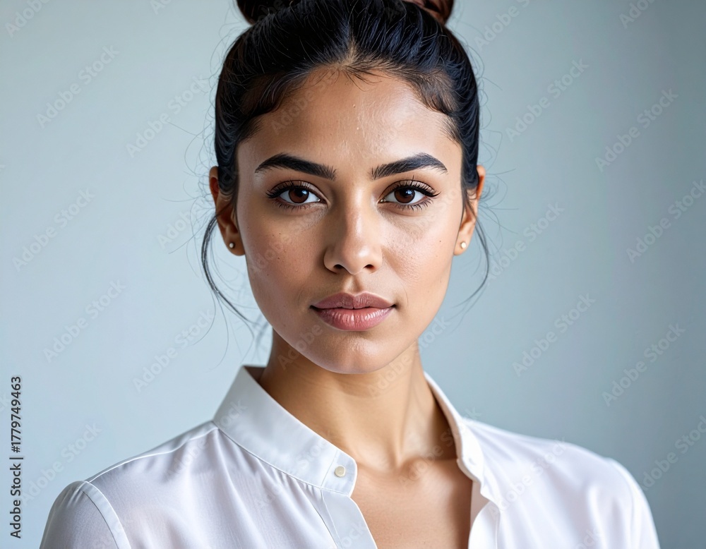Mujer de frente con cabello recogido en moño, blusa lisa clara, fondo neutro #1779749463