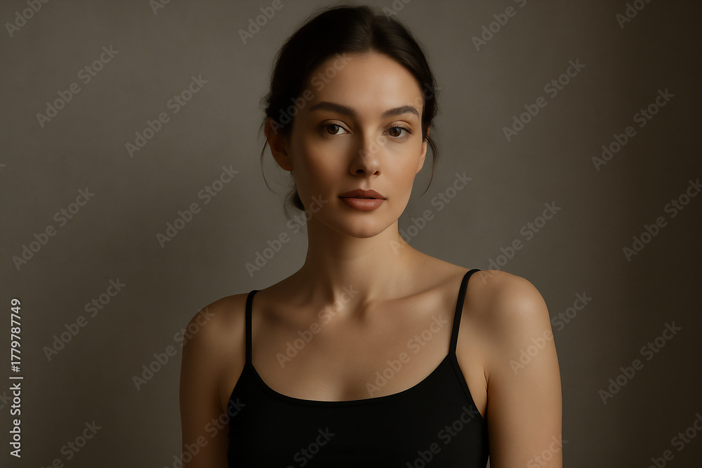 Mujer de frente con top negro liso, fondo gris neutro, luz suave lateral #1779787749