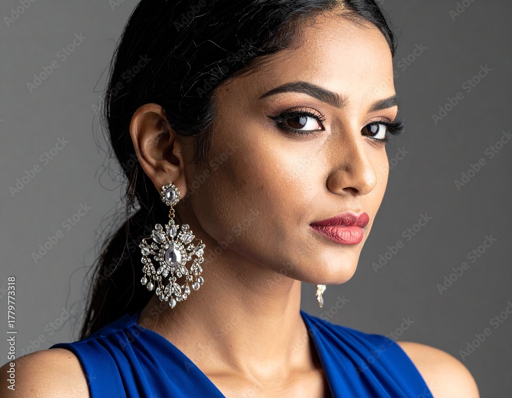 Mujer de frente con vestido elegante azul y pendientes grandes, fondo neutro gris #1779773318