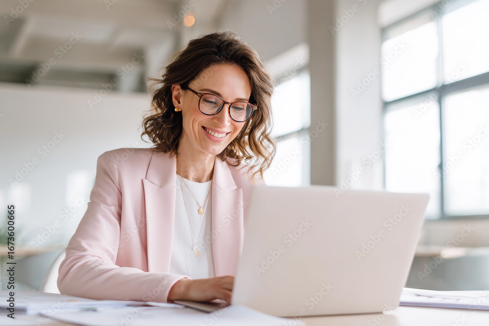 Mujer de negocios de 40, con chaqueta rosa, de traje, blusa blanca, gafas graduadas, sentada en una mesa dde despacho trabajando con el ordenador, con gran sonrisa en oficina luminosa con ventanales #1673600665