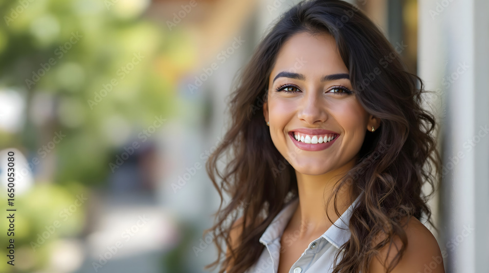 Mujer hispana de 20 años sonriendo con confianza en un espacio abierto con luz natural #1650053080