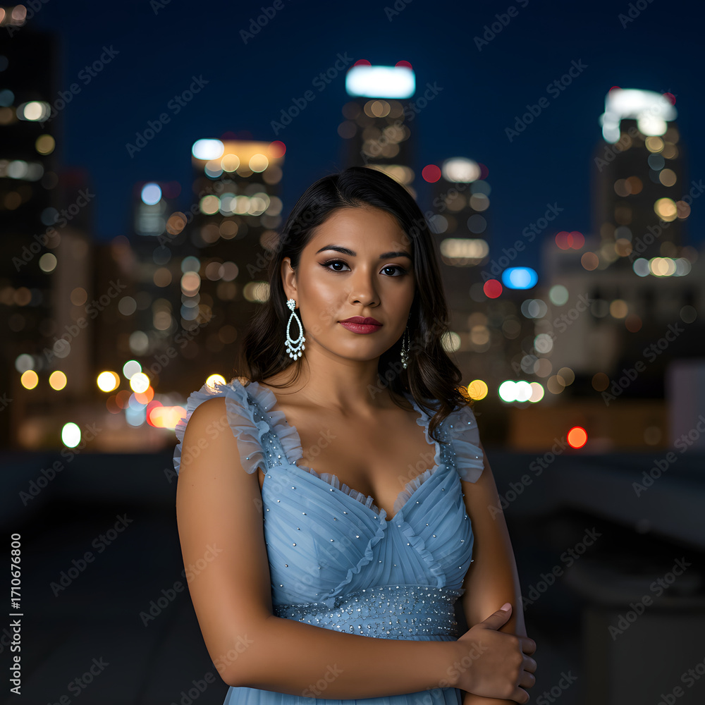 Mujer hispana elegante con vestido azul posando frente a las luces de la ciudad de noche #1710676800