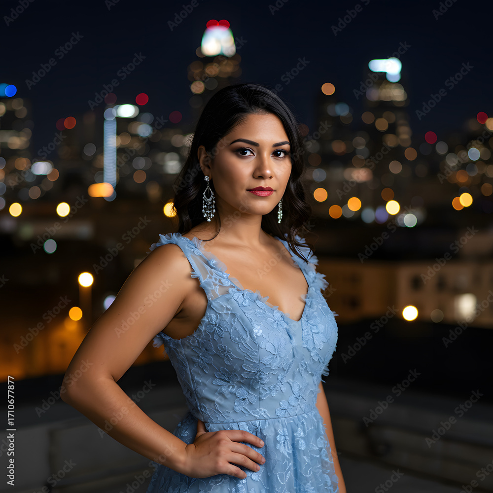 Mujer hispana elegante con vestido azul posando frente a las luces de la ciudad de noche #1710677877