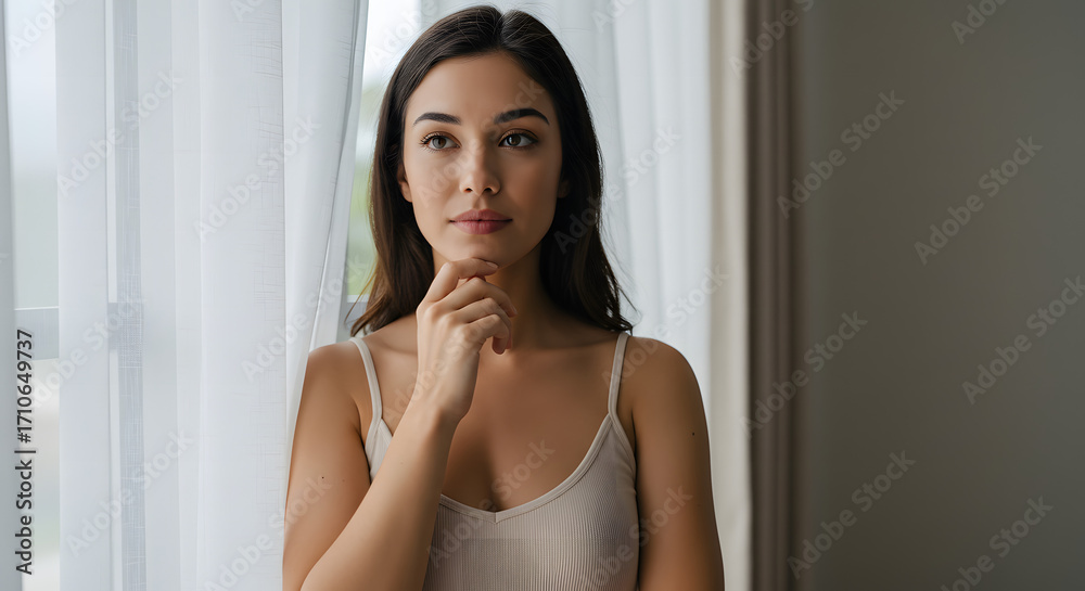 Mujer hispana pensativa mirando por la ventana #1710649737
