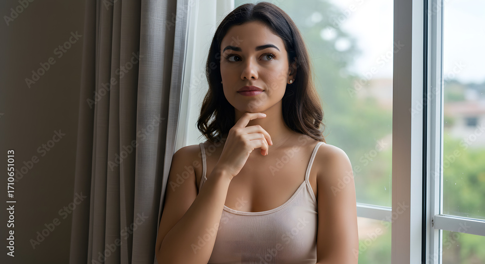 Mujer hispana pensativa mirando por la ventana #1710651013